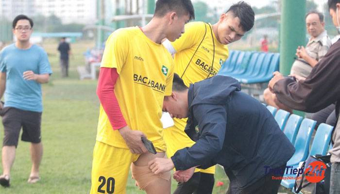Tiền đạo Phan Văn Đức (SLNA) có dấu hiệu chấn thương khi buộc phải ra nghỉ sớm trong khi đội vẫn đang tập chuẩn bị cho trận đấu vòng 3 V.League.